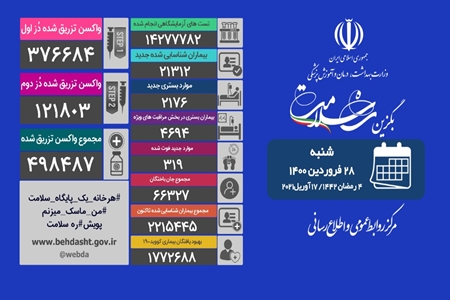 فوت ۳۱۹ بیمار کووید۱۹ در کشورطی ۲۴ ساعت گذشته مرکز روابط عمومی و اطلاع رسانی وزارت بهداشت، درمان و آموزش پزشکی اعلام کرد: تا کنون ۳۷۶ هزار و ۶۸۴ نفر دُز اول واکسن کرونا و ۱۲۱ هزار و ۸۰۳ نفر نیز دُز دوم را تزریق کرده اند و مجموع واکسن های تزریق شده در کشور به ۴۹۸ هزار و ۴۸۷ دُز رسید. اخبار شنبه 28 فروردین 1400 ادامه...