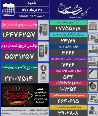 هم اکنون ۳۵۹ شهر کشور در وضعیت قرمز، ۵۹ شهر در وضعیت نارنجی، ۳۰ شهر در وضعیت زرد قرار دارند. فوت ۵۴۴ بیمار کرونا، تزریق ۲۲ میلیون و ۷ هزار و ۵۱۴ دُز واکسن شنبه 30 مرداد 1400 ادامه...